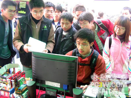 第一個進行SLI平臺體驗的竟然是一位MM,果然是巾幗不讓須眉啊。看她熟練的玩著極品飛車地下狂飆2,小編也不由感慨,這里不愧是華中地區最好的理工科學府啊,果真的臥虎藏龍。