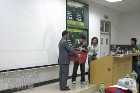 三位成績優異的同學高興的結果了這次趣味比賽的獎品——正版游戲軟件、光電鼠標以及DVD刻錄盤片。