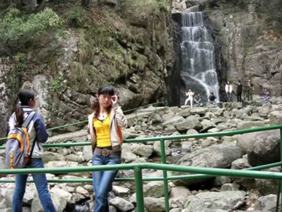 柘林瀑前美女倚架,后面的帥哥看過(guò)來(lái)。