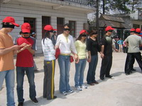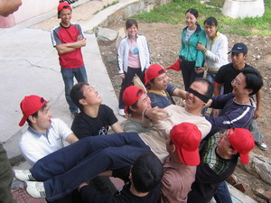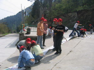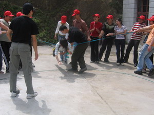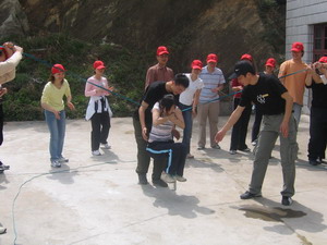 雷陣取水(在一個(gè)直徑4米的地面中間有一個(gè)裝滿水的杯子(作為假設(shè)的地雷),我們有的工具就是繩子和人,并且繩子和人都不能接觸圈內(nèi)的地面的情況下取出杯子,而且滴水不能灑。想一想可能嗎?當(dāng)然可以,團(tuán)隊(duì)的智慧和潛力是不可估量的。我們?cè)?分鐘的時(shí)間里做出了8種方案,利害吧:)