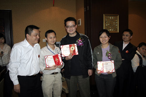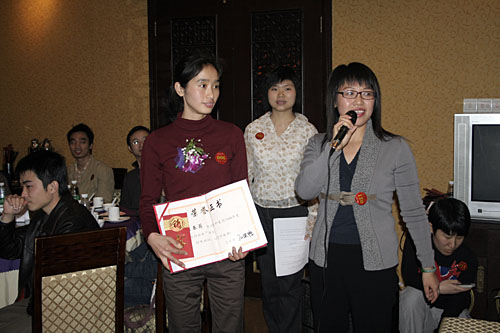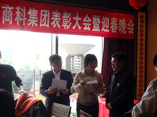 晚會開始前商科集團(tuán)領(lǐng)導(dǎo)對本年度表現(xiàn)優(yōu)秀的員工進(jìn)行了嘉獎和表彰他們是:第四季度部門之星:技術(shù)部 :敖亞軍、業(yè)務(wù)部:吳翠、市場部:臧永剛,第四季商科標(biāo)兵:財(cái)務(wù)部:羅春菊,第四季度銷售標(biāo)兵 :田勇,2006年度杰出員工:馮燕蘭,優(yōu)秀職能經(jīng)理 :楊毅,優(yōu)秀經(jīng)理 : 邵清泉