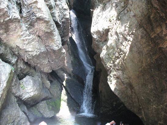 一線瀑 前行數(shù)米,老遠(yuǎn)就聽見驚天動地的“雷”聲,走近了才知那瀑布隱藏在一個巨大的石洞內(nèi),像龍嘴里吐出的白練,故稱之為龍喉瀑,上游之水如游龍一般通過一個跌巖穿入一個石縫,在石縫窟窿里形成一個“之”字形瀑布,因有石洞包圍,垂落下來時,其聲如虎狼咆哮,真是壯觀和驚心動魄。