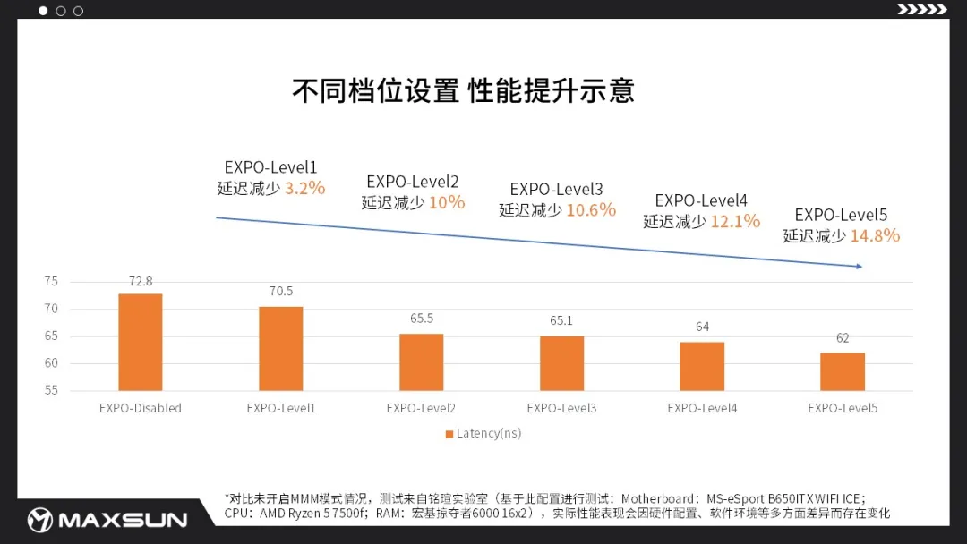 據銘瑄實驗室實測,開啟MMM模式Level5后對比未開啟MMM模式,讀寫性能提升9.1%,延遲減少14.8%,性能提升表現卓越(注:實際性能表現因硬件配置、軟件環境等多方面差異而存在變化,因架構差異原因,銳龍8000系列不支持該功能)。