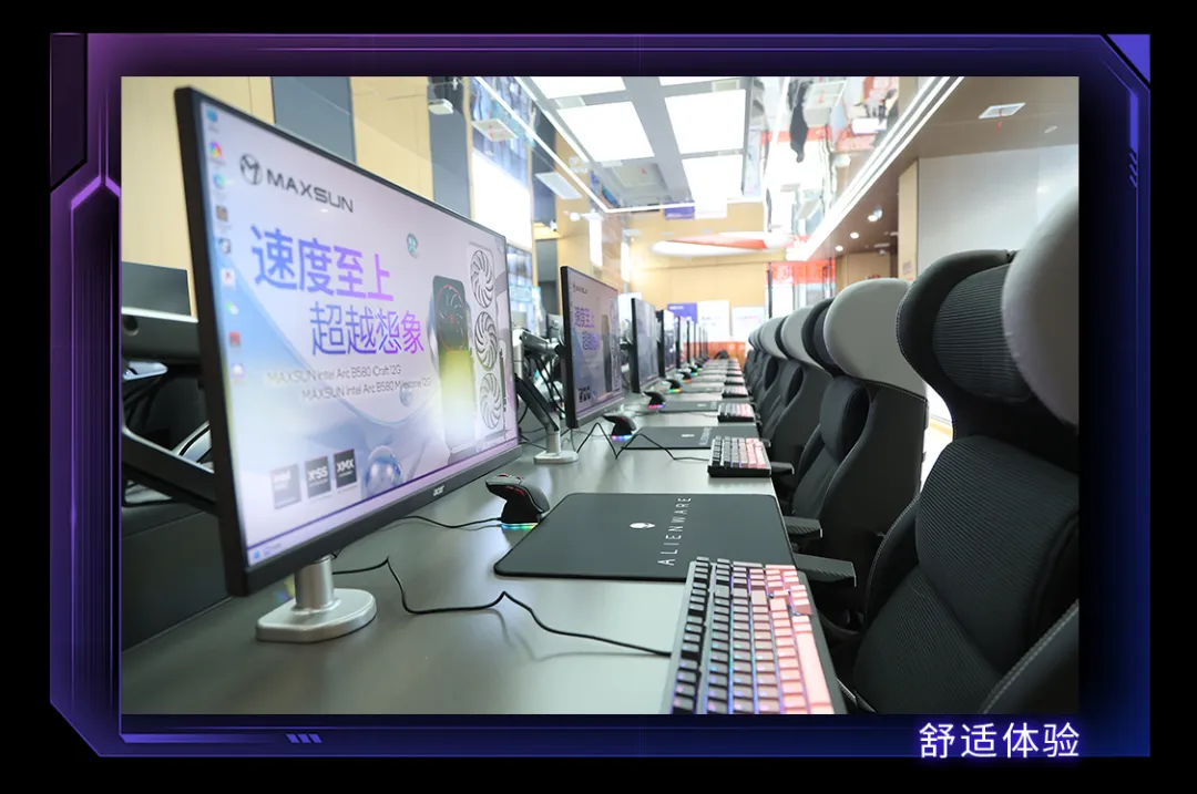 電競館劃分有單人房、雙人房、三人房、八人房等多種競技區(qū),全場共99臺(tái)機(jī)器,采用銘瑄板卡,包括B760系列主板、Z890系列主板和最新推出的銘瑄Intel Arc B580顯卡。電競館緊跟市場潮流,選擇時(shí)興的“3I平臺(tái)”(英特爾CPU+英特爾芯片組+英特爾GPU)為玩家提供強(qiáng)悍的性能加持。其中,MS-Challenger Z890M主板 x MAXSUN Intel Arc B580 Milestone 12G x 英特爾®酷睿™Ultra 200S系列處理器的超強(qiáng)搭配可謂最為亮眼。
