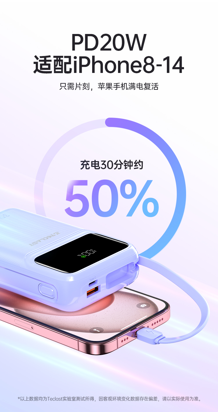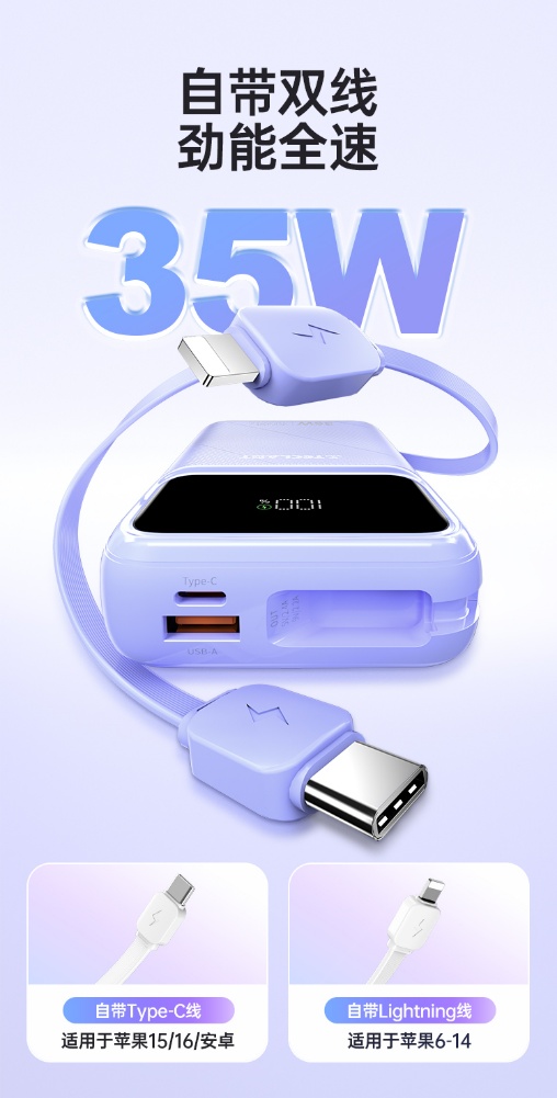 除了容量和快充功能,臺電 Teclast Q20 Pro 還自帶了一條 Type-C 線和一條 Lightning 線,適用于蘋果 iPhone 6~16 以及安卓設(shè)備。這意味著你無需再為不同設(shè)備準(zhǔn)備不同的充電線,就可以為你的所有設(shè)備充電,數(shù)字顯示屏也是這款移動電源的一個實(shí)用功能。你可以隨時查看剩余電量,了解移動電源的使用情況,避免在關(guān)鍵時刻出現(xiàn)電量不足的情況。