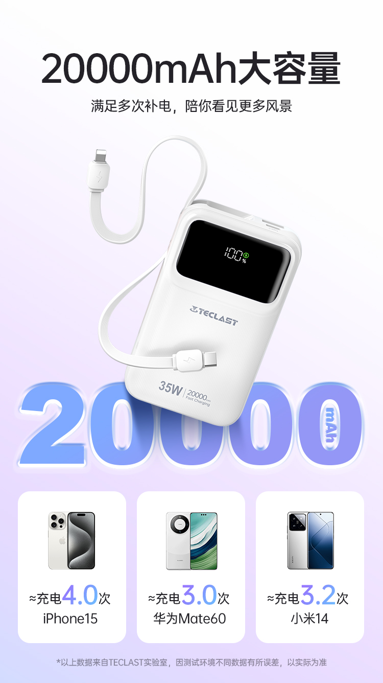 如今,臺電Teclast洞察到消費(fèi)者對充電速度的需求,重磅推出一款35W高功率輸出的充電寶,不僅能夠滿足蘋果手機(jī)用戶的快充需求,更以20000mAh的大容量和自帶雙線快充以及數(shù)字顯示屏等眾多優(yōu)勢,成為了眾多用戶的首選。