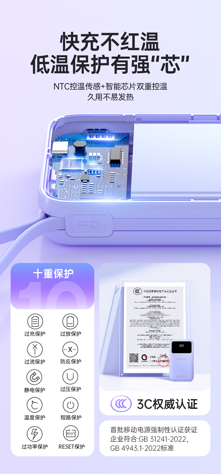 同時,隱藏式充電線凹槽的設(shè)計(jì)也非常貼心,你可以隨時把線收納起來,使移動電源更加整潔美觀。在安全性方面,臺電Teclast Q20 Pro 采用了 NTC 控溫傳感 + 智能芯片雙重控溫技術(shù),久用不易發(fā)熱。這不僅可以延長移動電源的使用壽命,還可以保證你的設(shè)備在充電過程中的安全,讓你放心使用。