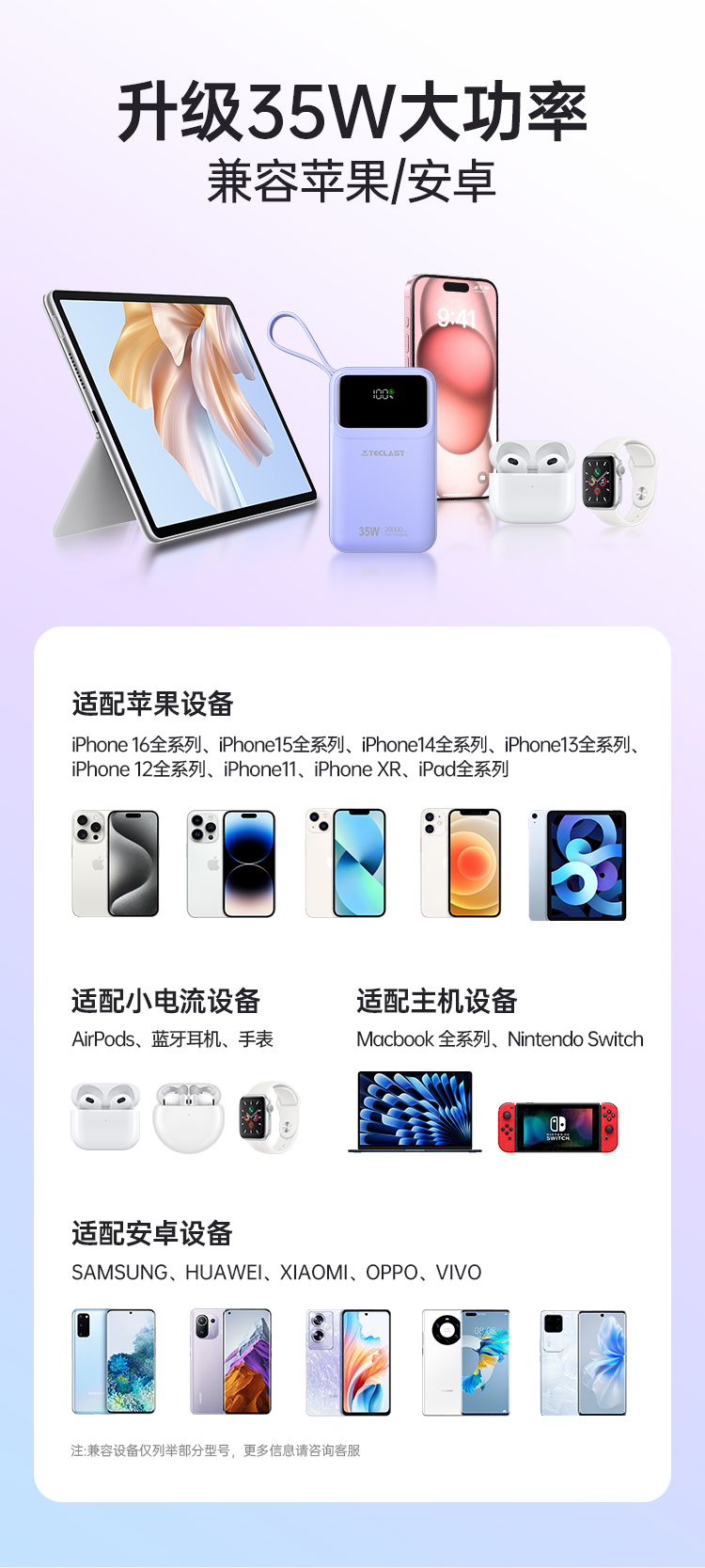 此外,它還支持 22.5W 的華為 SCP 超級快充,兼容各種智能手機(jī)、蘋果設(shè)備、藍(lán)牙耳機(jī)等等,無需擔(dān)心你的設(shè)備不兼容。