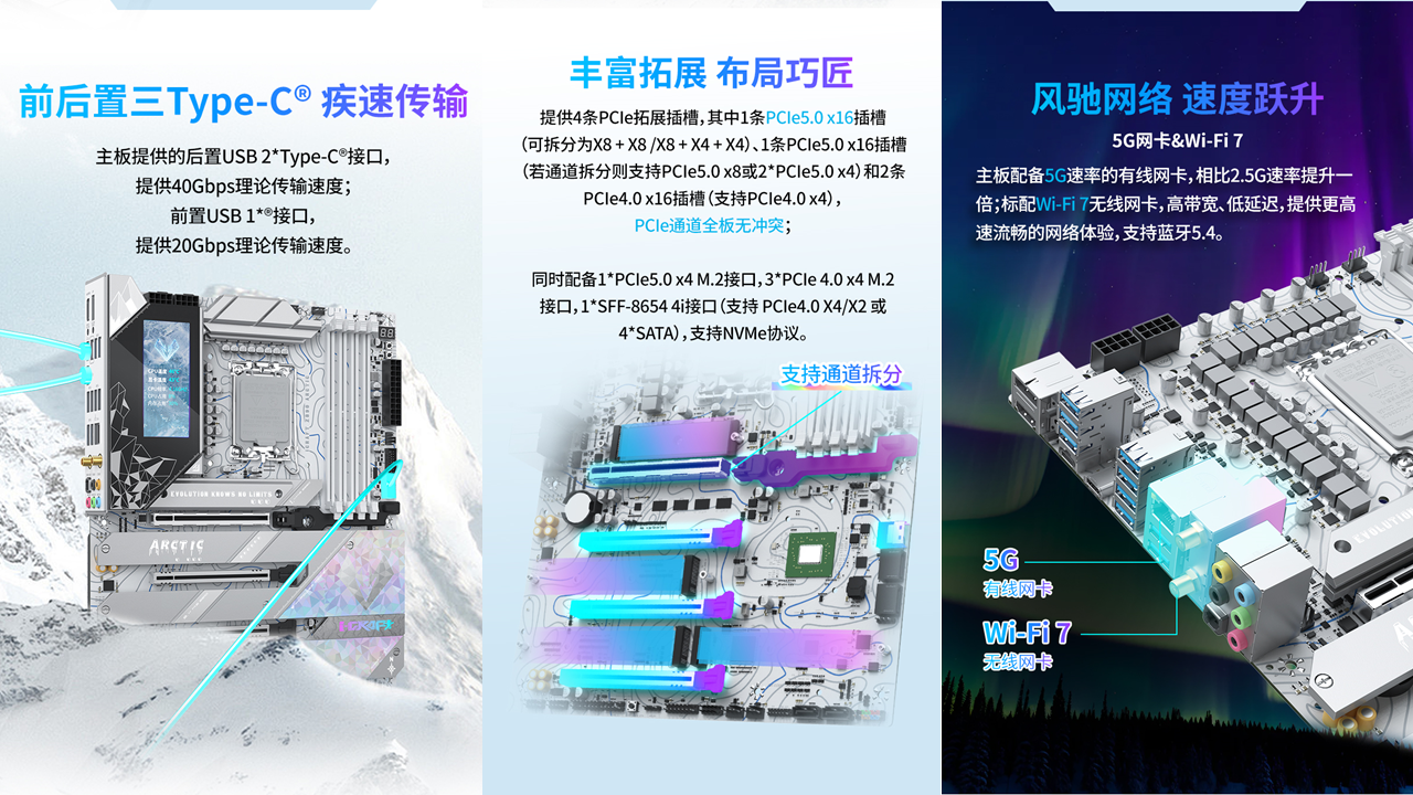 擴(kuò)展方面,提供4條PCle拓展插槽,其中1條PCIe 5.0 x16插槽支持靈活拆分,可根據(jù)需求調(diào)整為X8+X8 或 X8+X4+X4模式,滿足同時(shí)搭載高性能顯卡與PCIe擴(kuò)展卡的需求;板載的SFF-8654 4i接口,可靈活擴(kuò)展為PCIe 4.0 x4通道或4個(gè) SATA 接口,適配多設(shè)備存儲(chǔ)方案。I/O區(qū)域的兩個(gè)40Gbps速率USB4 Type-C 接口,配合DP 1.4與HDMI 2.1視頻接口,輕松滿足多設(shè)備連接需求。