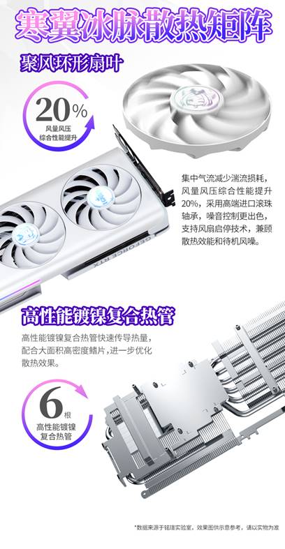 散熱方面,寒翼冰脈散熱矩陣實力護航。多風扇與高性能鍍鎳復合熱管強強聯合,再加上聚風環形扇葉設計,能快速導出核心高熱量,即便長時間高負載運行也能持續穩定輸出。配合風扇啟停技術,待機時靜謐無聲,游戲時全力散熱,完美平衡散熱效能與待機靜謐性。DP*3+HDMI 的全接口組合,無論是連接 4K 顯示器還是搭建多屏沉浸場景,都能輕松適配,滿足不同玩家的使用需求。
