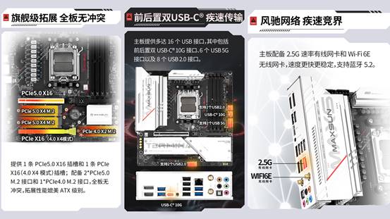 擴展方面,該主板拓展性能媲美ATX級別,提供1條PCIe5.0 X16插槽和1條PCIeX16(4.0 X4模式)插槽;配備2*PCIe5.0 M.2接口和1*PCIe4.0 M.2接口,全板無沖突,輕松滿足用戶各種拓展需求。提供多達16個USB接口,方便連接各種外接設備,滿足多樣化使用需求,網絡方面則配備2.5G速率有線網卡和Wi-Fi 6E無線網卡,支持藍牙5.2。高速穩定的網絡傳輸的,能有效避免《三角洲行動》多人在線對戰中的延遲、卡頓和數據丟包問題,讓你準確操控角色,反應迅速,發揮出更佳對戰水平。