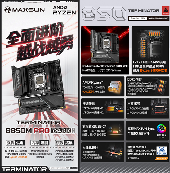 另外,銘瑄Terminator B850M PRO系列主板還推出了一款黑色版的銘瑄Terminator B850M PRO DARK WIFI。作為銘瑄終結者 PRO 系列的黑色款,這款主板將 “硬核美學” 貫徹到底,同樣的暗紅線條如機甲血脈般點綴,大面積的全金屬裝甲采用噴砂與拉絲工藝交織,打造出如同未來機甲般的冷峻質感,低調中透著霸氣。無論是搭配側透機箱展示內部硬件,讓每一處細節都成為視覺焦點;還是打造簡約風、電競風主機,這款黑色主板都能完美適配,輕松 hold 住各種裝機風格,滿足不同用戶的審美偏好。