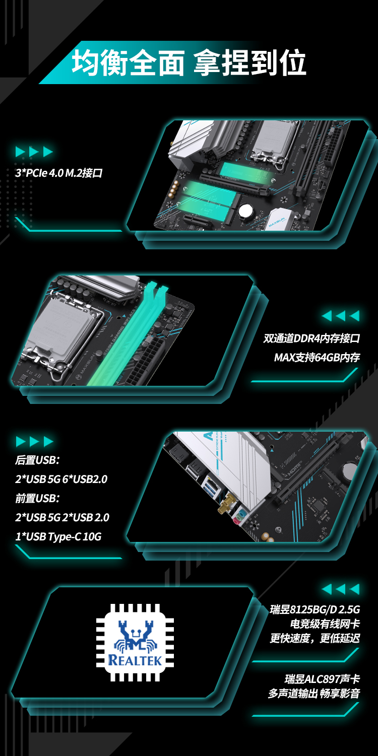 內存方面,銘瑄 B760M GAMING WIFI ACE D4 II 主板搭載2條DDR4內存插槽,最高支持64GB大容量,擁有3600MHz(OC)的超頻潛能,能充分釋放14代處理器的性能潛力,為3A游戲幀率提升、多任務處理提速提供強勁支撐。存儲方面,主板支持高速3*M.2硬盤接口,支持PCIe 4.0 X4通道NVMe協議,玩家可以自由選擇和擴展存儲設備,輕松提升系統性能,加載大型游戲也毫無壓力。