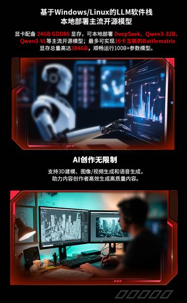 該卡創(chuàng)新采用雙GPU設(shè)計(jì),配備48GB GDDR6超大顯存,支持多種主流大模型部署,包括DeepSeek-r1:70B蒸餾量化版、Qwen3-32B、Qwen3-VL、Qwen3-Coder-30B等,并原生支持Pytorch、ISV支持、IPEX-LLM推理引擎、適配vLLM,滿足不同場(chǎng)景下的高性能運(yùn)算需求。