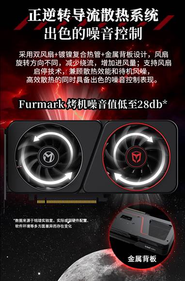 在散熱與靜音方面,該卡采用了正逆轉(zhuǎn)導(dǎo)流散熱系統(tǒng),配備雙風(fēng)扇、鍍鎳復(fù)合熱管與金屬背板,在確保高性能持久釋放的同時(shí),將運(yùn)行噪音控制在低水平,讓創(chuàng)作過程更專注。