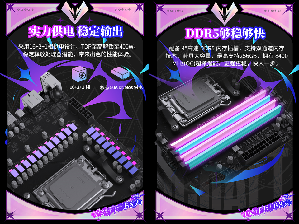 如果說AMD銳龍 7 9850X3D 處理器是性能核心,那銘瑄iCraft B850 AIGA主板就是為其量身定制的 “魔法戰甲”。它將二次元美學與旗艦級硬件規格深度融合,讓裝機不僅性能強悍,顏值更是賞心悅目,成為顏值黨與硬核玩家共同追捧的心頭好。