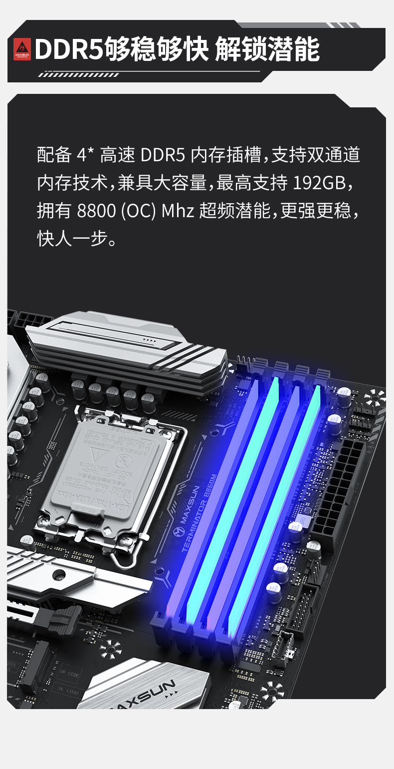 內(nèi)存方面,這款主板同樣能打。它配備4條高速DDR5內(nèi)存插槽,支持雙通道內(nèi)存技術(shù),兼具大容量,最高支持192GB,擁有8800 MHz(OC)超頻潛能,更強更穩(wěn)。再加上英特爾酷睿 Ultra 5 225F處理器對CUDIMM內(nèi)存的支持,更為沖擊高內(nèi)存頻率提供了可能。對于游戲玩家和追求高性能的用戶來說,高頻內(nèi)存能夠有效提升系統(tǒng)的數(shù)據(jù)讀寫速度,減少游戲加載時間,提升多任務(wù)處理能力,快人一步搶占先機。