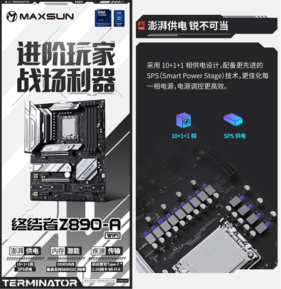 作為這套組合的“性能基石”,銘瑄Terminator Z890-A WIFI主板繼承了終結(jié)者系列的經(jīng)典配色,采用黑色 PCB 與銀色裝甲的搭配,整體風格沉穩(wěn)大氣又不失電競范兒。相較于上一代產(chǎn)品,在性能和外觀上都得到了全面升級。這款主板采用了10 + 1 + 1相供電設(shè)計,配備更先進的SPS(Smart Power Stage)技術(shù),更佳化每一相電源,電源調(diào)控更高效、更穩(wěn)定。即使在英特爾酷睿 Ultra 7 265K 處理器滿負荷運行場景下,也能持續(xù)提供穩(wěn)定且強勁的電力支持,為 3A 游戲的高幀率運行、多任務(wù)的流暢處理筑牢動力根基。