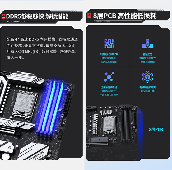 內(nèi)存拓展與性能表現(xiàn)上,這款主板同樣實力出眾。它配備4*高速DDR5內(nèi)存插槽,支持雙通道內(nèi)存技術(shù),兼具大容量,最高支持256GB,擁有8800 MHz(OC)超頻潛能,更強更穩(wěn)。再加上英特爾酷睿 Ultra 7 265K 處理器對 CUDIMM內(nèi)存的支持,更為沖擊高內(nèi)存頻率提供了可能。對游戲玩家和追求高性能的用戶來說,高頻內(nèi)存能夠有效提升系統(tǒng)的數(shù)據(jù)讀寫速度,減少游戲加載時間,提升多任務(wù)處理能力,帶來更流暢的畫面切換和更快的場景加載體驗。此外,主板采用 8 層服務(wù)器級 PCB 設(shè)計,配合背鉆工藝和優(yōu)化的菊鏈式布線,有效降低信號損耗,增強信號完整性,消除 Stub 效應,不僅保障了 DDR5 內(nèi)存的高速穩(wěn)定傳輸,更減少了電磁干擾,為整套平臺的高性能運行奠定了堅實基礎(chǔ)。