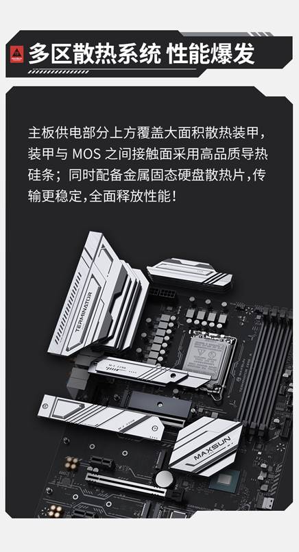 散熱能力是保障硬件長期穩(wěn)定運行的關(guān)鍵,銘瑄 MS-Terminator Z890-A WIFI 主板在散熱設(shè)計上同樣下足了功夫。主板供電部分上方覆蓋了大面積散熱裝甲,裝甲與 MOS 之間的接觸面采用高品質(zhì)導熱硅條,能夠快速導出供電模塊工作時產(chǎn)生的熱量;同時,主板還配備了金屬固態(tài)硬盤散熱片,有效降低固態(tài)硬盤在高速傳輸數(shù)據(jù)時的溫度,確保其傳輸穩(wěn)定性,全面釋放存儲性能。在這套強悍的多區(qū)散熱系統(tǒng)加持下,即便英特爾酷睿 Ultra 7 265K 處理器長時間高負載運行,主板也能保持較低溫度,避免因過熱導致的性能降頻,讓玩家在長時間鏖戰(zhàn)游戲或進行專業(yè)創(chuàng)作時無后顧之憂。