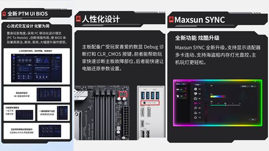 除了強悍的性能,這款主板在操作便捷性和個性化上也格外貼心。全新升級的 PTM UI BIOS,借鑒了手機 APP 的交互邏輯,采用模塊化設(shè)計,交互層級不超過 2 層。卡片式的界面一目了然,就算是裝機新手,也能輕松搞定 BIOS 設(shè)置。分布式 Debug 診斷燈和 CLR_CMOS 快捷按鈕,更是能快速定位故障,讓裝機過程省心又省力。它還支持RGB光效同步,可與顯卡、內(nèi)存等外設(shè)實現(xiàn)燈光聯(lián)動,炫酷燈光效果隨心切換,無論是打造酷炫的黑色電競主機,還是組裝顏值爆表的純白海景房,都能完美適配,輕松拿捏氛圍感。