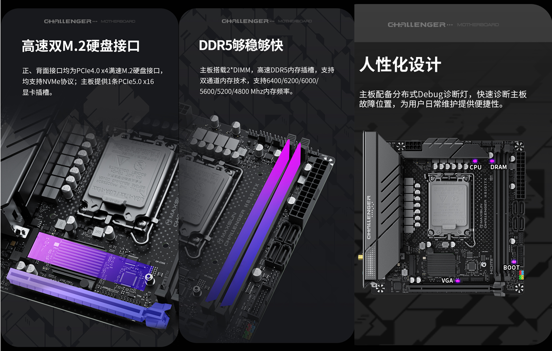 雖為迷你版型,但這款主板的拓展能力絲毫沒有“縮水”。存儲方面,正、背面各配備1個PCle 4.0×4滿速 M.2 接口,均支持NVMe協議,主板還提供1條PCle 5.0×16顯卡插槽;內存方面,搭載2條DDR5內存插槽,支持雙通道技術,兼容4800/5200/5600/6000/6200/6400MHz主流內存頻率,最大支持96GB容量,用戶可根據需求靈活升級。且主板內置 WIFI 6 無線網卡與藍牙5.2模塊,WIFI 6支持更高的傳輸速率與更多設備連接,即便沒有網線,也能享受穩定流暢的網絡;藍牙5.2則方便連接無線鼠標、鍵盤、耳機等外設,減少桌面線材雜亂。此外,主板還提供4個SATA接口與12個USB接口,無論是連接機械硬盤、外接硬盤,還是接入U盤、打印機等外設,都能滿足需求。