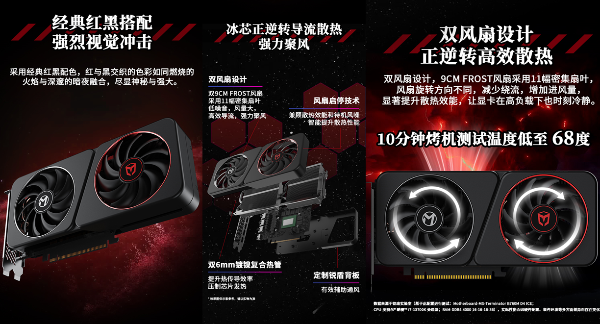 這款顯卡外觀設計上經典紅黑配色很具視覺沖擊力,紅與黑交織如同火焰撞入暗夜,神秘又霸氣,放在桌面就是顏值擔當。核心性能更是硬核,20 個 Xe 內核搭配 2850MHz 超高加速頻率,無論是 3A 游戲的高負載場景,還是專業創作的算力需求,都能流暢響應;12GB GDDR6 大顯存 + 456GB/S 高速帶寬,數據傳輸無瓶頸,復雜多任務處理也游刃有余。散熱與實用功能雙在線:雙 9CM FROST 正逆轉風扇搭配 11 幅密集扇葉,減少繞流、提升進風量,配合雙 6mm 鍍鎳復合熱管與定制銳盾背板,10 分鐘烤機溫度低至 68℃,高負載下也能冷靜運行;支持風扇啟停技術,兼顧散熱效能與待機靜音。接口配置豐富實用,3 個 DP2.1+1 個 HDMI2.1a 接口,多屏顯示、超高清影音、高分辨率游戲需求全覆蓋,還搭載雙硬件編解碼器,支持 AV1 格式與 Intel Deep Link 超級編碼,讓直播推流更順暢,視頻剪輯導出速度大幅提升,創作效率直接翻倍。