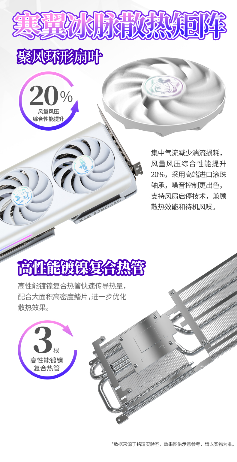 長時間沉浸式游戲,散熱與噪音控制是關鍵。銘瑄GeForce RTX 5060 Ti iCraft OC8G 璦珈顯卡配備了寒翼冰脈散熱矩陣,采用三風扇搭配高性能鍍鎳復合熱管快速傳導熱量,配合大面積高密度鰭片,進一步優(yōu)化散熱效果。風扇采用高端進口滾珠軸承,聚風環(huán)形扇葉設計能集中氣流、減少湍流損耗,讓風量風壓綜合性能提升 20%,同時噪音控制更出色。更貼心的是智能啟停技術,低負載時風扇自動停轉,實現(xiàn) "零噪音" 待機;高負載激戰(zhàn)時刻,風扇迅速啟動高效散熱,將核心溫度穩(wěn)穩(wěn)控制。