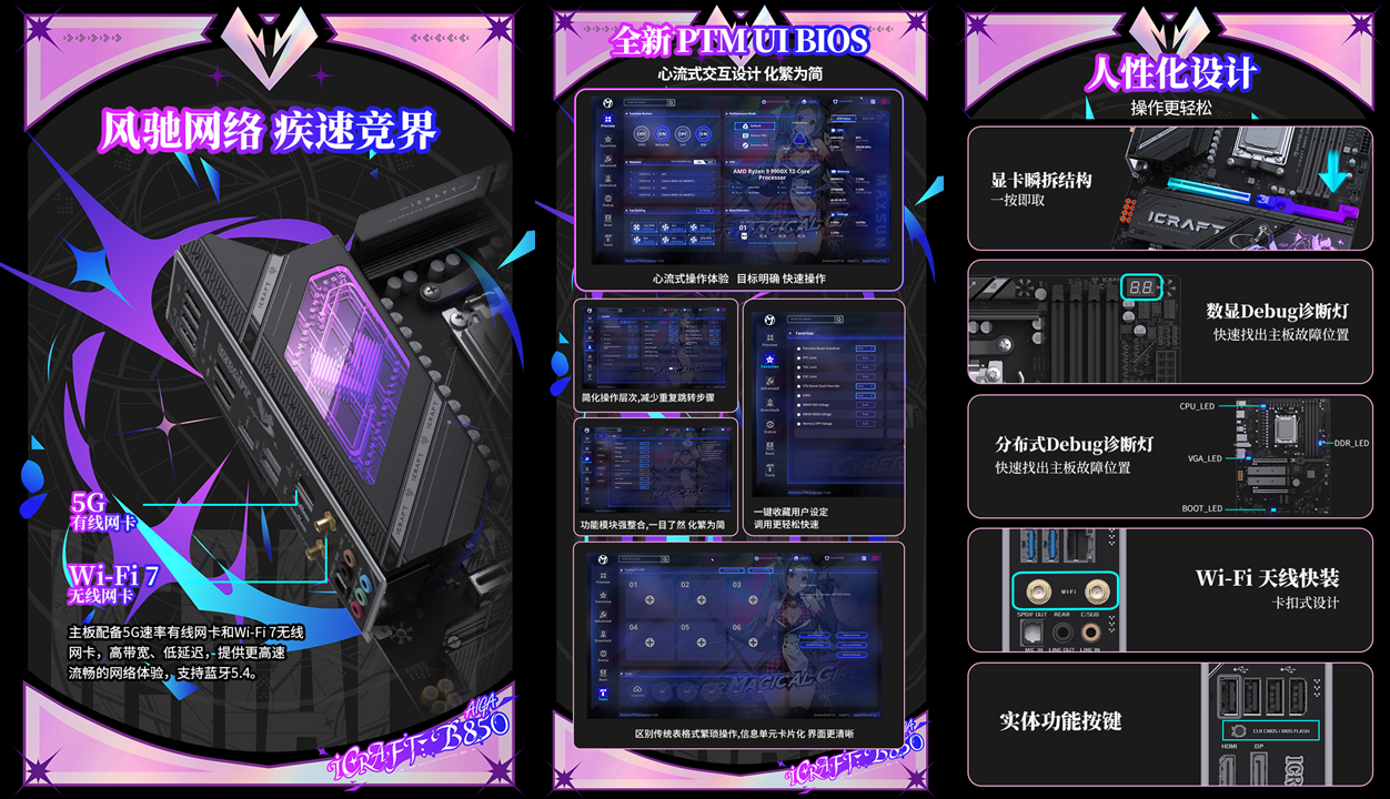 網絡體驗與操作便捷性上這款主板也毫不遜色。5G 速率有線網卡與 Wi-Fi 7 無線網卡的雙旗艦配置,搭配藍牙 5.4,無論是在宿舍連接校園無線網絡,還是接入有線寬帶,都能實現高帶寬、低延遲的網絡傳輸,在線游戲對戰時告別卡頓掉線,線上聽課、高清視頻會議、大型文件下載時流暢無阻。全新升級的 PTM UI BIOS 更是一大亮點,借鑒手機 APP 交互邏輯,將功能模塊化且交互層級精簡至 2 層以內,還特別加入璦珈魔術師形象,新手也能輕松完成 BIOS 調試;顯卡瞬拆結構、Wi-Fi 天線快裝、數顯 Debug 診斷燈等 E-touch 人性化設計,讓裝機和調試過程告別繁瑣,省心又高效,小白也能輕松上手。