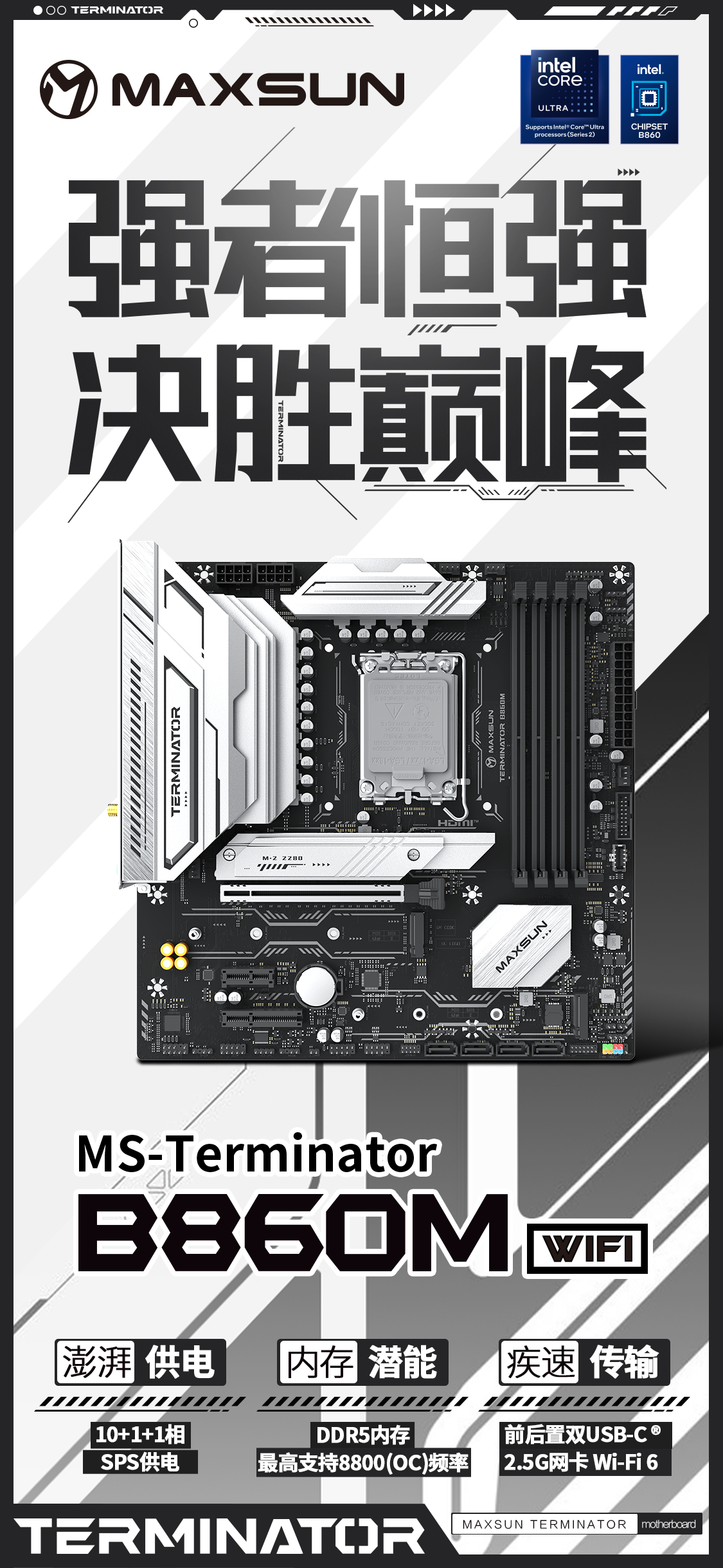 MS-Terminator B860M WIFI是銘瑄終結(jié)者系列的主流爆款,采用Micro-ATX板型,外觀上延續(xù)了終結(jié)者系列的經(jīng)典撞色設(shè)計(jì),黑色PCB搭配銀白色散熱裝甲,低調(diào)中透著科技感。供電部分覆蓋大面積散熱裝甲,裝甲與MOS之間采用高品質(zhì)導(dǎo)熱硅條,快速傳導(dǎo)熱量,確保供電穩(wěn)定。供電方面,其采用10+1+1相SPS供電設(shè)計(jì),配備SPS智能供電技術(shù),電源調(diào)控高效穩(wěn)定,可充分釋放處理器的性能,即便處理器滿負(fù)載運(yùn)行,也能避免卡頓、掉幀問題,內(nèi)存方面,配備4條DDR5內(nèi)存插槽,支持雙通道技術(shù),最高支持192GB容量,擁有8800 MHz(OC)超頻潛能,更強(qiáng)更穩(wěn)。搭配新處理器的內(nèi)存優(yōu)化,大幅提升系統(tǒng)讀寫速度與多任務(wù)處理能力。