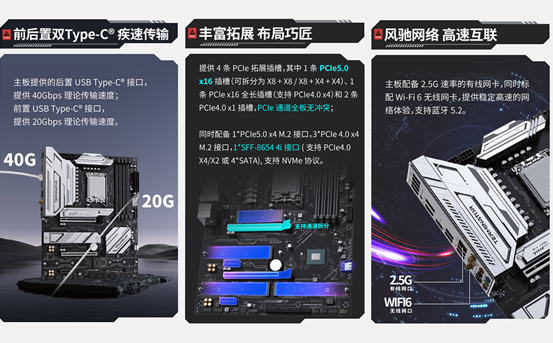 在拓展性方面,該主板展現出了強大的兼容性和實用性,能夠滿足玩家多樣化的硬件拓展需求。主板提供 4 條 PCle 拓展插槽,其中 1 條 PCle5.0 x16 插槽(可拆分為 X8+X8/X8+X4+X4)、1 條 PCle x16 全長插槽(支持 PCle4.0 x4)和 2 條 PCle4.0 x1 插槽,全板 PCle 通道無沖突。存儲接口方面,主板配備 1 個 PCle5.0 x4 M.2 接口、3 個 PCle4.0 x4 M.2 接口以及 1 個 SFF-8654 4i 接口(支持 PCle4.0 X4/X2 或 4*SATA),且均支持 NVMe 協議。此外,主板還配備前后置雙 Type-C 接口,后置 USB Type-C 接口理論傳輸速度可達 40Gbps,前置 USB Type-C 接口理論傳輸速度為 20Gbps,輕松實現疾速傳輸,滿足玩家的高效數據交互需求。網絡體驗也不拉胯,主板配備 2.5G 速率有線網卡和 Wi-Fi 6 無線網卡,同時支持藍牙 5.2,有線、無線雙模式自由選擇,無需額外升級。不管是游戲對戰時的低延遲需求,還是遠程辦公的穩定連接要求,都能輕松應對。