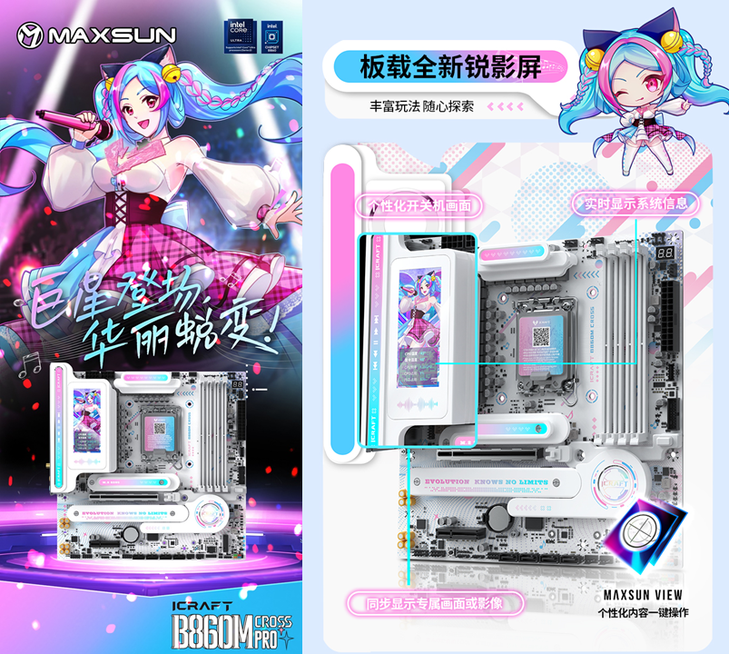作為顏值旗艦,銘瑄iCraft B860M CROSS PRO璦珈主板將次元美學融入硬件設計。主板全覆蓋著藍粉漸變的二次元紋路,每一處細節都透著精致感。吸睛亮點莫過于全新配備的3.4英寸銳影LED顯示屏,不僅能實時顯示CPU溫度、內存頻率等系統信息,讓玩家隨時掌握硬件狀態,還能自定義開關機畫面,甚至支持桌面映射,同步展示專屬壁紙或游戲畫面。搭配配套軟件MAXSUN View,玩家可以盡情解鎖無限自定義玩法,讓主板成為主機的 “個性門面”。