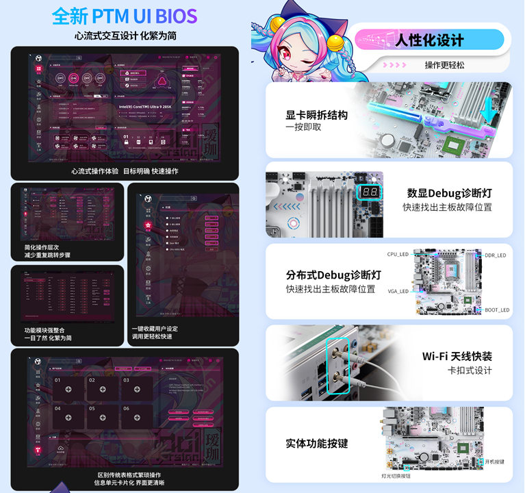除了強悍的性能與豐富的功能,銘瑄 iCraft B860M CROSS PRO主板在操作便捷性和個性化打造上,也格外貼心,全方位提升用戶的使用與裝機體驗。全新升級的 PTM UI BIOS,借鑒了手機 APP 的交互邏輯,采用模塊化設計,交互層級不超過 2 層,卡片式的界面一目了然,就算是裝機新手,也能輕松搞定 BIOS 設置。同時主板配備顯卡瞬拆結構和 Wi-Fi天線快裝設計,無需繁瑣操作,讓裝機、硬件升級更便捷;數顯+分布式 Debug 診斷燈能一眼識別故障位置,省去繁瑣排查步驟,讓玩家專注享受裝機與游戲的樂趣。